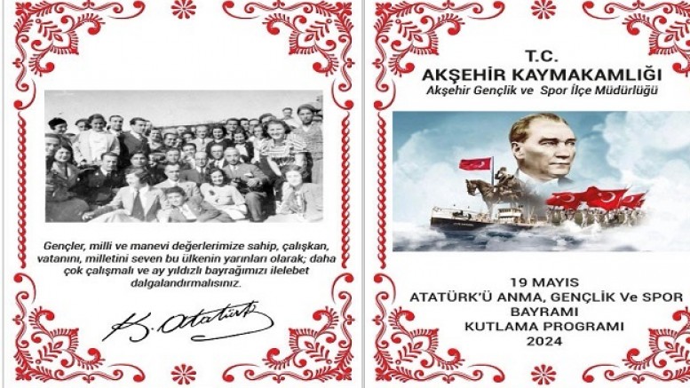 Edinilen bilgiye göre; 19 Mayıs Atatürk’ü Anma ve Gençlik Bayramı kapsamında ilk tören Pazar günü Cumhuriyet Meydanı’ndaki çelenk sunma programı ile başlayacak. Saat 09.15’de Gençlik ve Spor İlçe Müdürlüğü’nün çelenginin sunulmasıyla başlayacak program saygı duruşunda bulunulması ve akabinde İstiklal Marşımız söylenmesi ile devam edecek.Kutlama Programı 19 Mayıs 2024 Pazar günü saat 10.00’da Cumhuriyet Meydanındaki törenle devam edecek.Gençlik ve Spor İlçe Müdürü tarafından günün anlam ve önemi ile ilgili konuşma yapılması, saygı duruşunda bulunulması, İstiklal Marşımızın okunması ile devam edecek program; öğrenciler tarafından şiirler okunması, Ödül Töreni, Akşehir Yöresine Ait Halk Oyunları Gösterisi, Bando Gösterisi, Taekwondo Gösterisi, Basketbol Gösterisi, Cimnastik Gösterisi ile sona erecek.