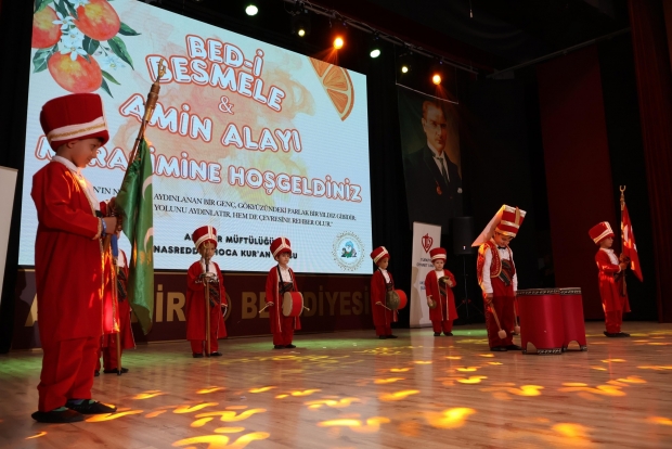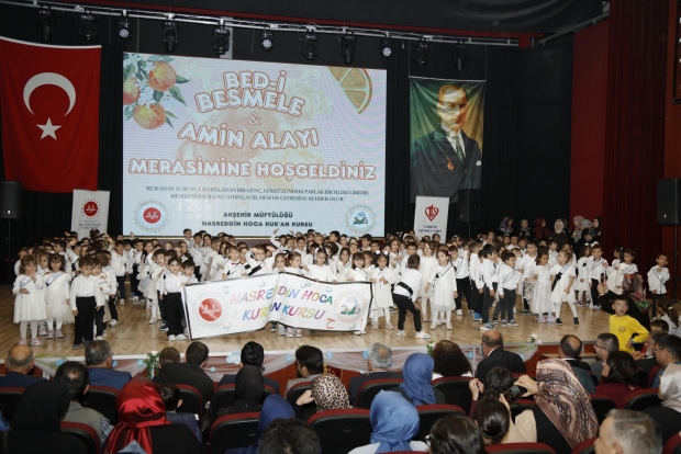 Akşehir İlçe Müftülüğüne bağlı Nasreddin Hoca 4-6 Yaş Kur’an Kursu öğrencileri, yeni eğitim dönemine “Besmele” ile başladı. Eğitime başlama geleneğini simgeleyen “Bed-i Besmele” programı, Akşehir Kültür Merkezi’nde coşkulu bir katılımla gerçekleştirildi. Programa Akşehir Kaymakamı Dr. Mustafa Yiğit, Akşehir Belediye Başkanı Dr. Ahmet Nuri Köksal, İlçe Müftüsü Ahmet Müjdeci, İlçe Emniyet Müdürü Beytullah Ekerbiçer, İlçe Jandarma Komutanı Üsteğmen Yıldıray Erdem, Millî Eğitim Şube Müdürü İbrahim Öncel, siyasi parti temsilcileri, öğrenci velileri ve çok sayıda davetli katıldı. Minik öğrenciler sahneye çıkarak mehter takımı gösterisi, semazen gösterisi ve ilahi dinletisi gibi birbirinden güzel performanslar sergiledi. Veliler, çocuklarının ilk sahne deneyiminde duygulu anlar yaşarken program izleyicilerden büyük alkış aldı. Etkinlik, yapılan dua ve toplu fotoğraf çekiminin ardından sona erdi.