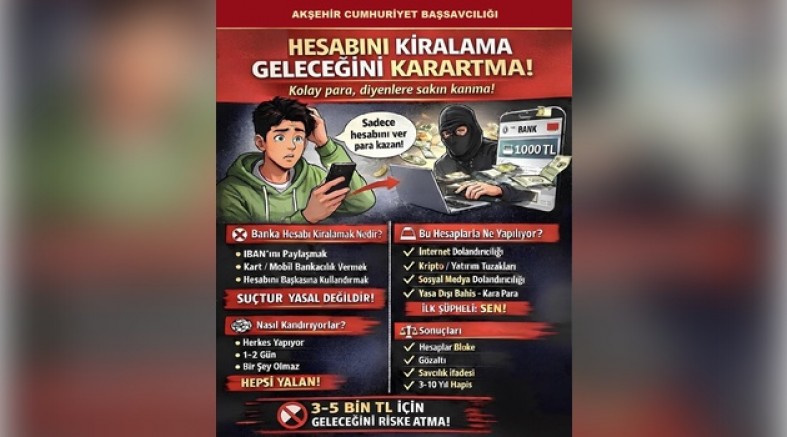 Akşehir Cumhuriyet Başsavcılığı Bilişim Suçları Soruşturma Bürosu, son dönemde artış gösteren IBAN dolandırıcılığı vakalarına ilişkin kapsamlı bir uyarı yayımladı. Yapılan açıklamada, özellikle gençler ve ekonomik zorluk yaşayan vatandaşların hedef alındığına dikkat çekilerek, banka hesaplarının üçüncü kişilere kullandırılmasının ciddi hukuki sonuçlar doğurduğu vurgulandı.