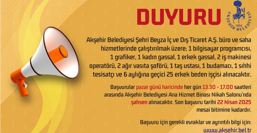 İlgili pozisyonlara başvurmak isteyen adaylar, müracaat koşulları ve başvuru için gerekli evraklara Akşehir Belediyesi’nin resmi internet adresi olan www.aksehir.bel.tr üzerinden ulaşabilecekler.