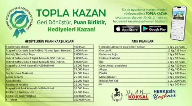 Akşehir Belediye Başkanı Dr. A. Nuri Köksal, “Belediyemizin yazılım altyapısıyla geliştirilen ve hayata geçirilen Topla Kazan uygulamamız hizmete girdi. Bu uygulamayla birlikte geri dönüşüm bilincini artırmayı, ilçe temizliğine kalıcı katkı sağlamayı ve daha yaşanabilir bir Akşehir’i gelecek nesillere bırakmayı hedefliyoruz. Hemşehrilerimizin sürece aktif katılımı bizim için çok kıymetli. Topla Kazan uygulamamızın ilçemize hayırlı olmasını diliyorum” dedi.