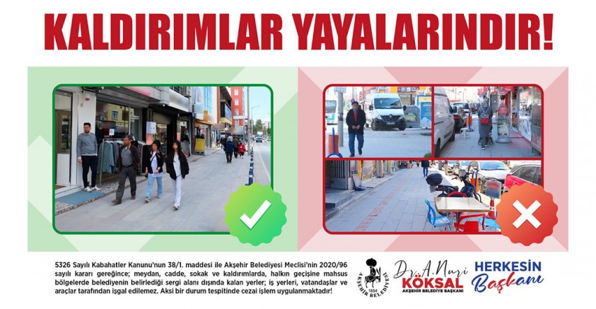 Akşehir Belediyesi’nce kaldırımların sadece yayaların geçişine tahsis edildiği ; ön bahçe mesafeleri ve belediye tarafından belirlenen sergi alanı dışında kalan kaldırımların vatandaşlar veya iş yerleri tarafından işgal edilmemesi , vatandaşlar tarafından kaldırımlar üzerine araç park edilmemesi gerektiği bu işgallerin önüne geçebilmek için denetimlerin artırılacağı ve ihlallerin tespiti halinde cezai işlemlerin uygulanacağı belirtildi.