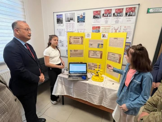 Fuarda, öğrenciler danışman öğretmenlerinin rehberliğinde hazırladıkları projeleri ziyaretçilere sunarken; katılımcılar, projeleri inceleyerek öğrencilerle sohbet etti.
