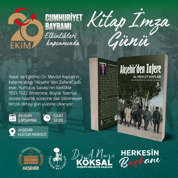 Cumhuriyet Bayramı etkinlikleri, saat 12.00’de Rüştü Bey Hanı’nda düzenlenecek özel bir imza günüyle başlayacak. Dr. Mevlüt Kaplan’ın kaleme aldığı “Akşehir’den Zafere” adlı eser, 1921–1922 yılları arasında Akşehir’in Büyük Taarruz’daki stratejik rolünü, karargâh günlerini ve bu dönemde alınan kritik kararların arka planını tarihsel belgeler ışığında anlatıyor.