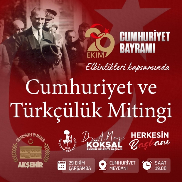 Akşehir’de Cumhuriyet Bayramı etkinlikleri, saat 19.00’da Cumhuriyet Meydanı’nda düzenlenecek “Cumhuriyet ve Türkçülük Mitingi” ile taçlanacak. Akşehir Belediyesi tarafından organize edilen miting, Cumhuriyet’in kurucu değerleriyle Türk milletinin birlik ve beraberlik ruhunu bir araya getirecek. Meydanı dolduracak coşkulu kalabalık, 102 yıllık Cumhuriyet’in onurunu ve gururunu hep birlikte yaşayacak.