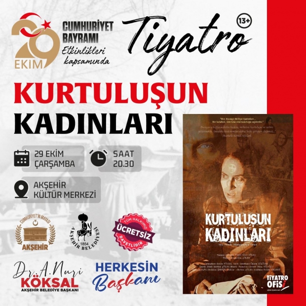 Günün son etkinliği saat 20.30’da Akşehir Kültür Merkezi’nde sahnelenecek “Kurtuluşun Kadınları” adlı tiyatro oyunu olacak. 13 yaş ve üzeri izleyicilere hitap eden oyun, kadınların Kurtuluş Savaşı’ndaki fedakârlıklarını ve direnişini sahneye taşıyacak. Ücretsiz olarak izlenebilecek oyun, Cumhuriyetin temel taşlarından biri olan kadın mücadelesine bir kez daha dikkat çekecek.