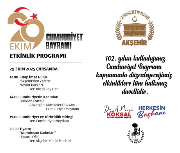 Akşehir Belediyesi, Cumhuriyetin değerlerini yaşatmak ve gelecek kuşaklara aktarmak amacıyla 29 Ekim Çarşamba günü birbirinden anlamlı etkinlikler düzenleyecek. Kitap imza gününden bisiklet kortejine, mitingden tiyatroya uzanan programla ve vatandaşların katılımıyla Cumhuriyet coşkusu şehir geneline yayılacak.