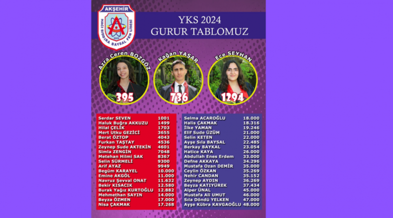Akşehir Hacı Sıddıka Baysal Fen Lisesi 2024 YKS sonuçlarının ilan edilmesiyle ilk 30 bin sıralamasına 30 öğrencisini sokarak büyük bir başarı elde etti.