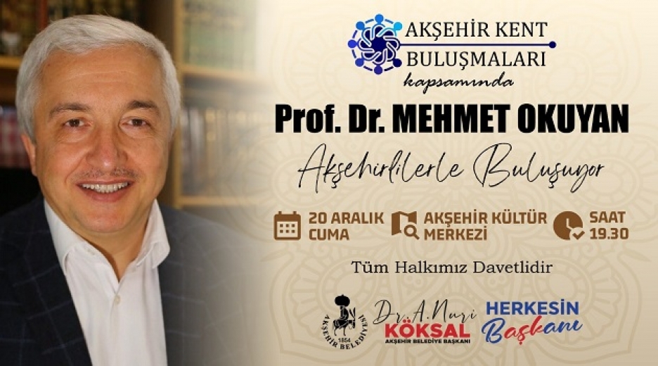 Akşehir Kent Buluşmaları kapsamında İlahiyatçı, Araştırmacı Yazar ve Televizyon Programı Sunucusu Prof. Dr. Mehmet Okuyan konferans verecek.