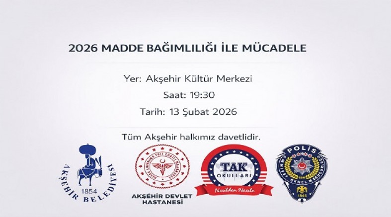 Toplumda madde bağımlılığına karşı farkındalık oluşturmak ve özellikle gençleri bilinçlendirmek amacıyla gerçekleştirilecek program, 13 Şubat 2026 Cuma günü saat 19.30’da Akşehir Kültür Merkezi’nde yapılacak.