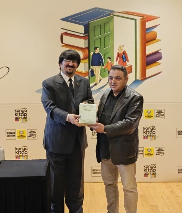 Konya Büyükşehir Belediyesi Yayınlar Şube Müdürü Vural Kaya tarafından günün anısına hediye takdim edilmesiyle sona eren söyleşiden sonra Başkan Şahin okurlarına kitaplarını imzaladı.