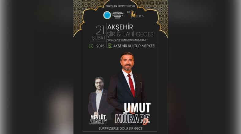 Cankurtaran İlim Kültür Sanat Yardımlaşma ve Dayanışma Derneği ( CAN-İLİM-DER ) tarafından 21 Şubat Cuma günü saat 20.15’de Akşehir Kültür Merkezi’nde Şiir & İlahi Gecesi düzenleniyor. Sanatçı Umut Mürare’nin ilahi ve ezgileri ile iştirak edeceği geceye, Mevlüt Atasoy’un da okuyacağı şiirlerle renk katması bekleniyor.