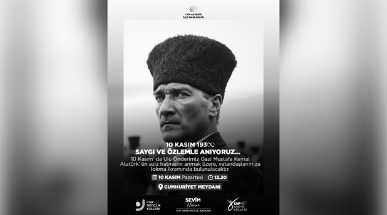 Cumhuriyet Halk Partisi (CHP) Akşehir İlçe Başkanlığı, Cumhuriyetimizin Kurucusu ve Büyük Önder Gazi Mustafa Kemal Atatürk’ün ebediyete intikalinin yıl dönümü dolayısıyla anlamlı bir etkinlik düzenleyecek. 10 Kasım Pazartesi günü saat 13.30’da Cumhuriyet Meydanı’nda gerçekleştirilecek etkinlikte, CHP Akşehir İlçe Kadın ve Gençlik Kolları tarafından vatandaşlara lokma ikramında bulunulacak. CHP Akşehir İlçe Başkanı Sevim Uzun, yaptığı açıklamada şunları söyledi: “Cumhuriyetimizin kurucusu Gazi Mustafa Kemal Atatürk’ü ebediyete intikalinin yıl dönümünde saygı, özlem ve minnetle anıyoruz. Bu anlamlı günde, Atamızın aziz hatırasını yaşatmak üzere vatandaşlarımıza lokma ikramında bulunacağız. Tüm hemşehrilerimizi etkinliğimize davet ediyoruz."
