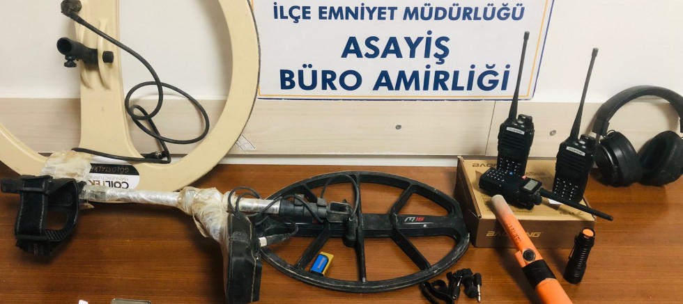 Yapılan aramalarda 1 adet dektör, 1 adet şarj aleti, 1 adet kulaklık, 1 adet el feneri, 1 adet el detektörü, 1 adet hassas terazi, 3 adet el telsizi, 63 gram katı ve toz halinde siyah toz ile 14 adet Helenistik, Roma, Osmanlı ve Selçuklu dönemine ait olduğu değerlendirilen akçe ele geçirildi. Ele geçirilen malzemelere el koyan asayiş büro amirliği ekipleri şüpheli R.M. yi de göz altına aldı.