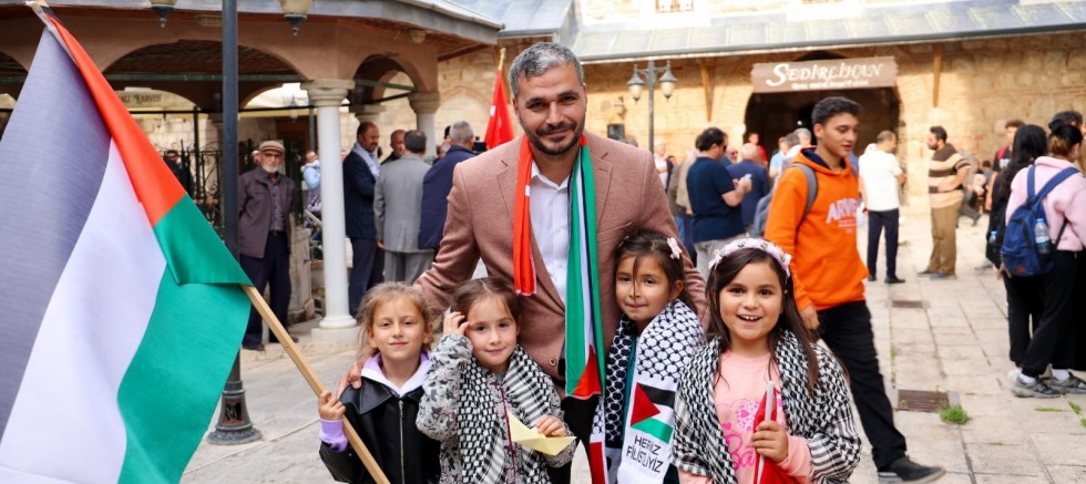 Ilgın Belediye Başkanı Ömer Apil’in çağrısı üzerine vatandaşlar, Sumud Filosu’na destek amacıyla tarihi Lala Mustafa Paşa Külliyesi Kurşunlu Cami avlusunda bir araya geldi.