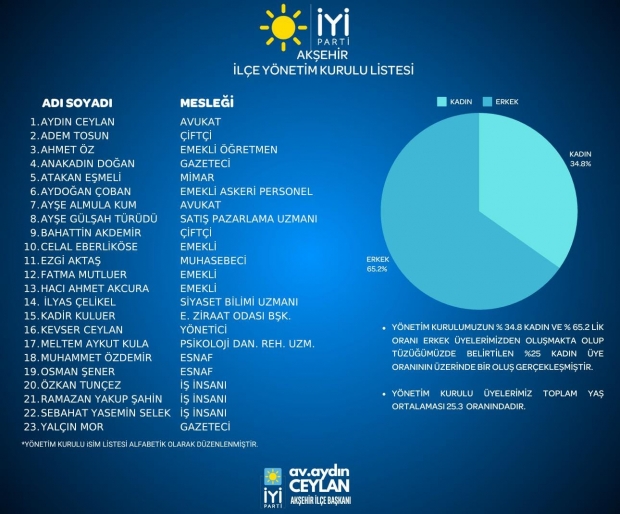 Yaş ortalaması 25.3 ve %35 Kadın kotası ile İYİ Partimizin en genç ve dinamik yönetim kurulunu oluşturan Konya-Akşehir ilçe Başkanımız Aydın Ceylan ve değerli yönetim kurulu üyelerine başarılar dilerim.