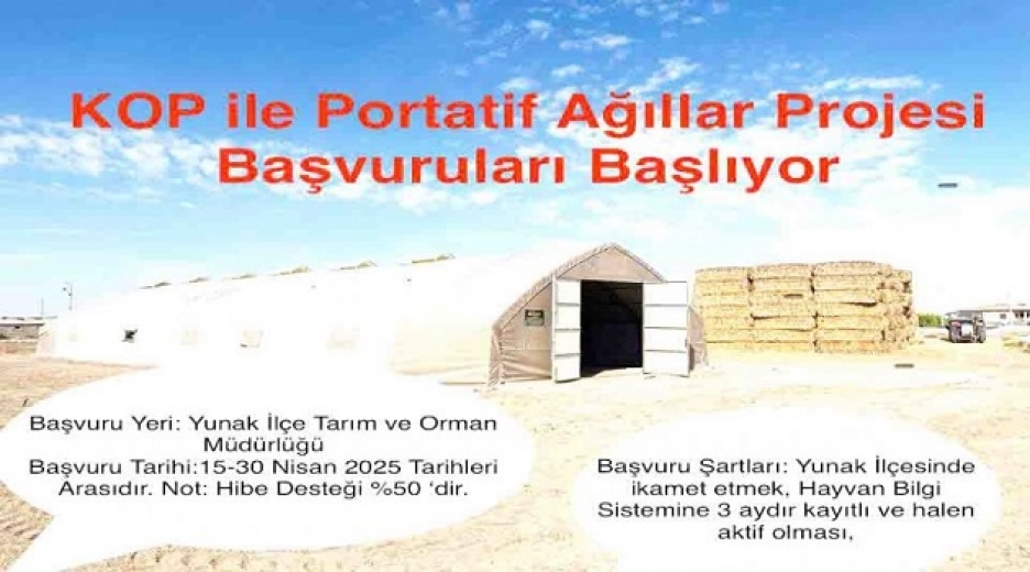Konuyla ilgili yapılan açıklamada şu ifadelere yer verildi: “İlçe Müdürlüğümüzce hazırlanan KOP Bölge Kalkınma İdaresi Başkanlığınca kabul edilen %50 hibeli Portatif Çadır Ağıl desteğinden faydalanmak isteyen üreticilerimizin 15 Nisan-30 Nisan 2025 Tarihleri arasında Yunak İlçe Tarım ve Orman Müdürlüğüne şahsen müracaat etmeleri gerekmektedir
