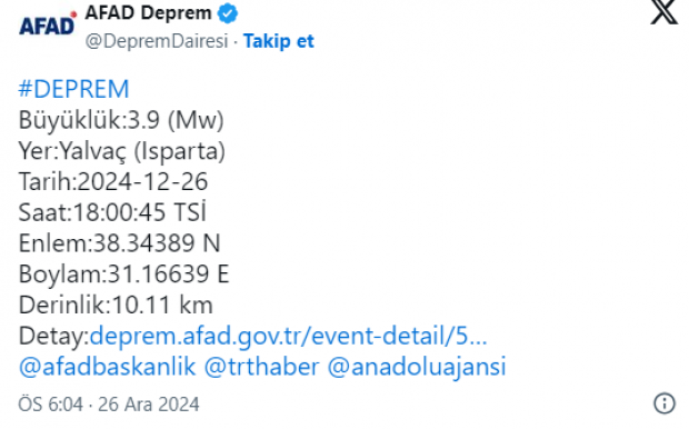 Afet ve Acil Durum Yönetimi Başkanlığının (AFAD) internet sitesinde yer alan bilgiye göre, saat 18.00'de merkez üssü Isparta'nın Yalvaç ilçesi olan 3,9 büyüklüğünde deprem kaydedildi. Depremin 10,11 kilometre derinlikte meydana geldiği belirlendi.