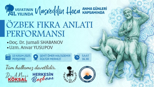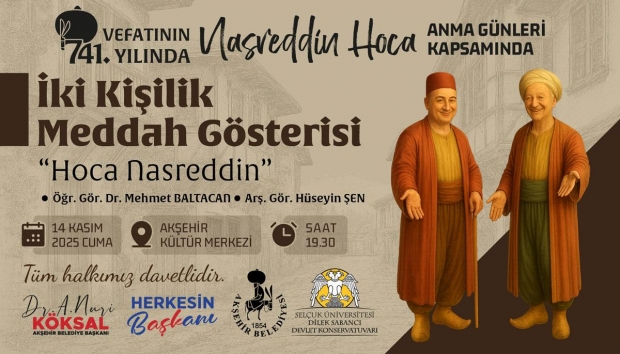 Anma programı, 14 Kasım Cuma günü saat 19.30’da Akşehir Kültür Merkezi’nde sahnelenecek “Hoca Nasreddin” adlı iki kişilik meddah gösterisiyle sona erecek. Gösteri, Selçuk Üniversitesi Devlet Konservatuvarı öğretim üyeleri Mehmet Baltacan ve Hüseyin Şen tarafından sanatseverlerin beğenisine sunulacak.