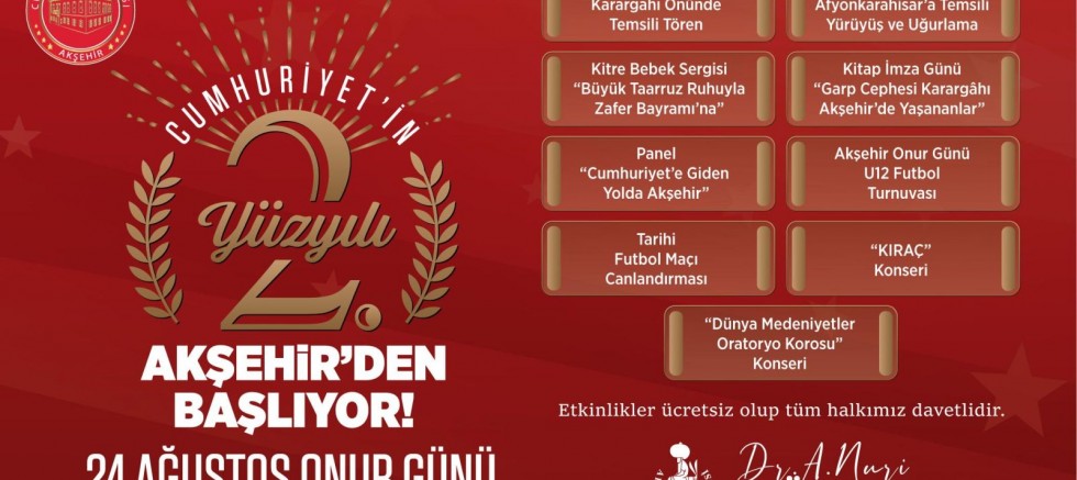 24 Ağustos Akşehir Onur günü etkinlikleri kapsamında ve Akşehir Belediyesi’nin öncülüğünde düzenlenen kutlama programı, “Cumhuriyetin 2.Yüzyılı Akşehir’den Başlıyor” sloganıyla 24-25 Ağustos 2024 tarihlerinde gerçekleştirilecek. 28 Temmuz 1922 tarihinde Akşehir’de oynanan, Büyük Taarruz kararlarının açıklandığı ve Gazi Mustafa Kemal Atatürk’ün Nutuk’ta yer verdiği tarihi futbol maçının bir kez daha canlandırılması, temsili Atatürk ve askerlerin Şuhut’a uğurlanması ve Kıraç konseri gibi programlar da etkinlikler arasında yer alacak. “Cumhuriyetin 2.Yüzyılı Akşehir’den Başlıyor” sloganıyla gerçekleştirilecek Akşehir 24 Ağustos Onur Günü etkinlikleri kapsamında ilk başlayacak programda Belediye Meclisinin Haziran ayı ikinci oturum toplantısında gündem maddelerinden biri olan Akşehirli Şehit Uzman Çavuş Selçuk Özer'in isminin Yarenler Mahallesi'ndeki bir parka verilmesi görüşülmüştü. Akşehir Belediye Başkanı A. Nuri Köksal'ın teklifiyle ve tüm meclis üyelerinin katılımıyla Şehit Selçuk Özer'in ismi oy birliği ile Yarenler Mahallesi'ndeki parka verildi. Parkın açılışı Saat, 10.30’ da geniş katılımla gerçekleştirilecek, Açılış bitimiyle İplikçi camiinde tüm şehit ve gaziler için Mevlid-i Şerif okutulacak. Onur Günü etkinlikleri Cumhuriyet Meydanında 13:30’da düzenlenecek olan resmî törenle başlayacak. Atatürk Anıtı’na çelenk sunulmasının ardından saygı duruşunda bulunulacak ve İstiklal Marşı’mız okunacak. Daha birçok güzel etkinliklerle onur günümüzü siz Akşehirli halkımızla kutlamaya davet ediyoruz.
