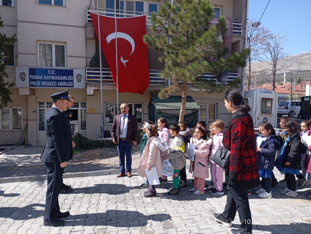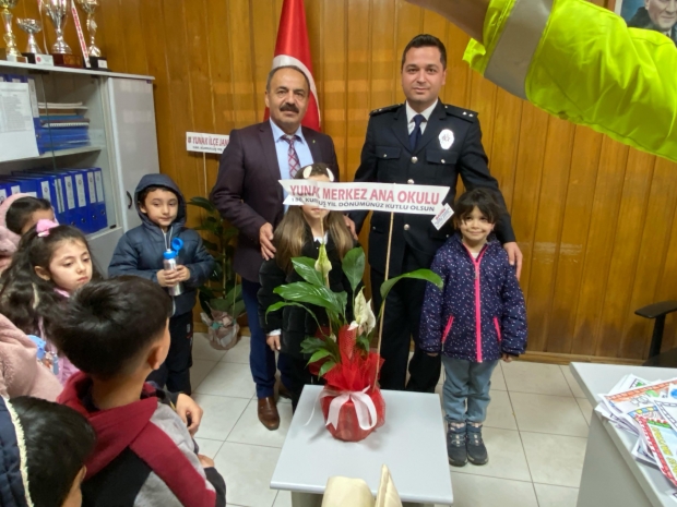 Yunak İlçe Milli Eğitim Müdürü Mahmut İşcan da, Merkez Anaokulu ve Atatürk İlkokulu öğrencileriyle Yunak İlçe Emniyet Amirliğini ziyaret ederek emniyet mensuplarının günlerini kutladılar.