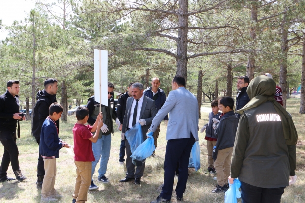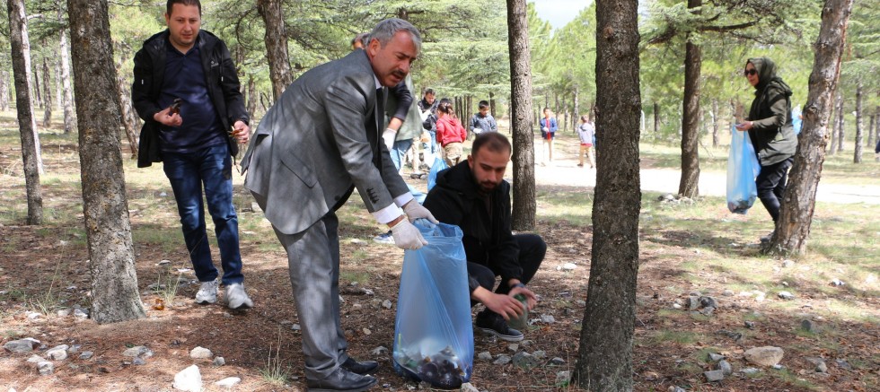 Yapılan konuşmanın ardından orman yangınlarına farkındalık yaratmak için ormanlık alanda bulunan çöpler, el birliğiyle toplandı.